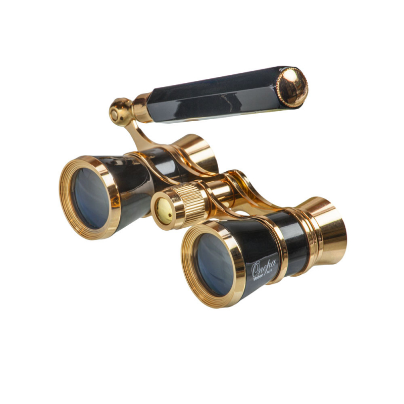 Светосильный, корпус — металл, оптическое стекло с просветлением. Отделка глянцевым черным лаком и напылением «золото». Регулируемое межзрачковое расстояние, фокусировка, лорнет.