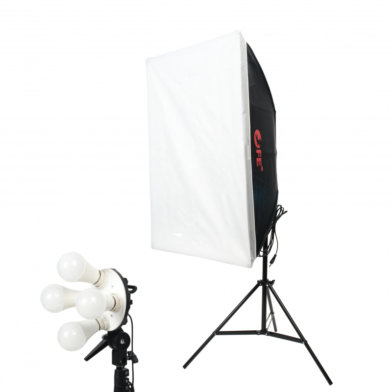 Комплект постоянного света для видео/фотосъемки: четырехламповый патрон-осветитель LH-E27х4 (4х25Вт, 5500±100 К, CRI?88) с регулируемой мощностью (1/2 мощности, полная), съемный софтбокс 60х80 см, стойка 188 см