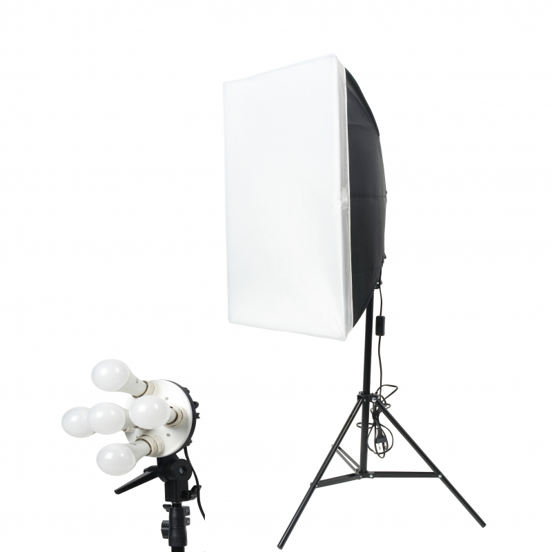 Комплект постоянного света для видео/фотосъемки: пятиламповый патрон-осветитель LH-E27х5 (5х18Вт, 5500±100 К, CRI>90) с регулируемой яркостью (2/5 мощности, 3/5 мощности, полная), съемный софтбокс 50х70 см, стойка 188 см