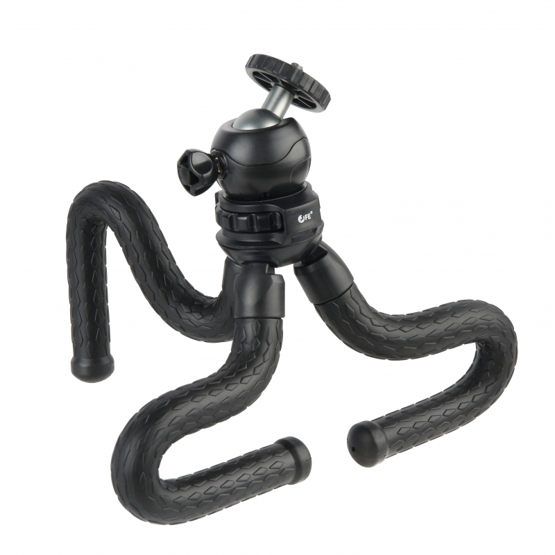 Компактный штатив с гибкими ножками. Нагрузка до 1.2 кг, максимальная высота 30 см, длина в сложенном виде 32 см, шаровая головка в комплекте с адаптером для смартфона и камеры GoPro, вес 320 г.
