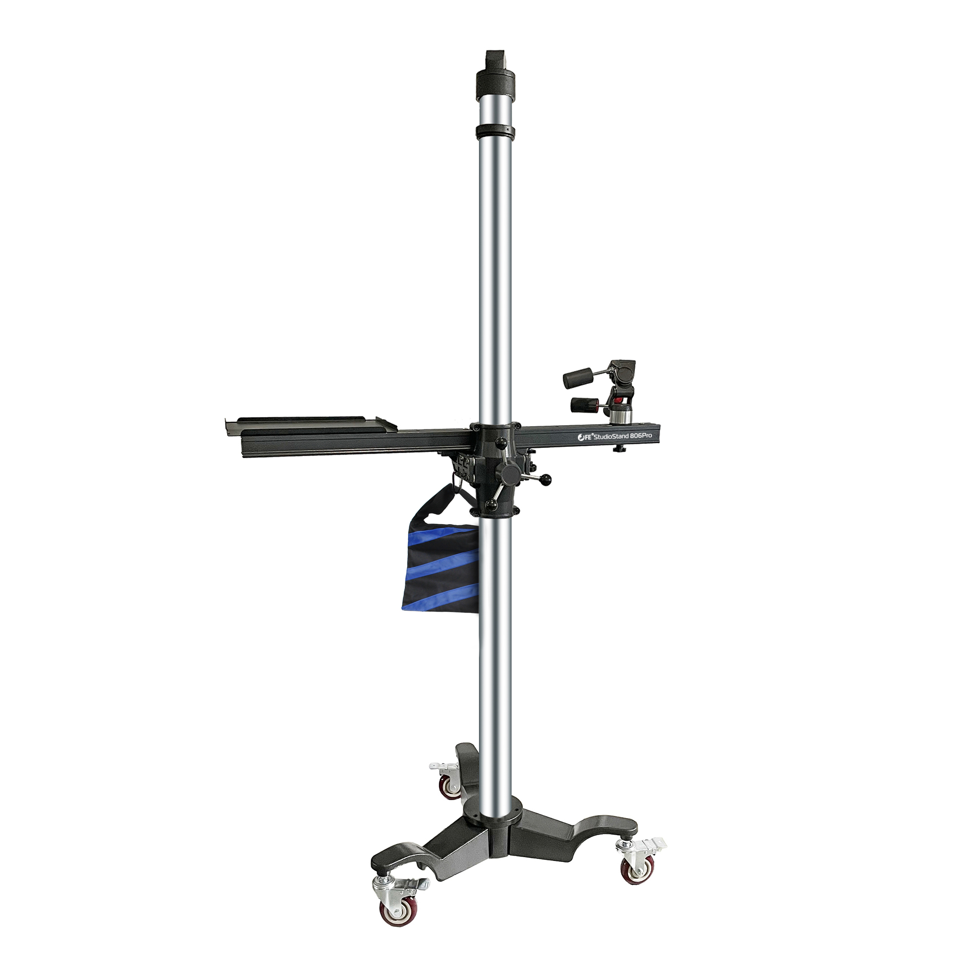 Штатив-колонна с горизонтальной штангой, наклонно-поворотная штативная 3D-головка с быстросъемной площадкой с винтом 1/4'' (переходная гайка на 3/8''), лоток для ноутбука. Нагрузка до 20 кг, рабочая высота 61–197 см, односекционная колона ?75 мм, основание с 3 колесами, сталь, вес 68 кг
