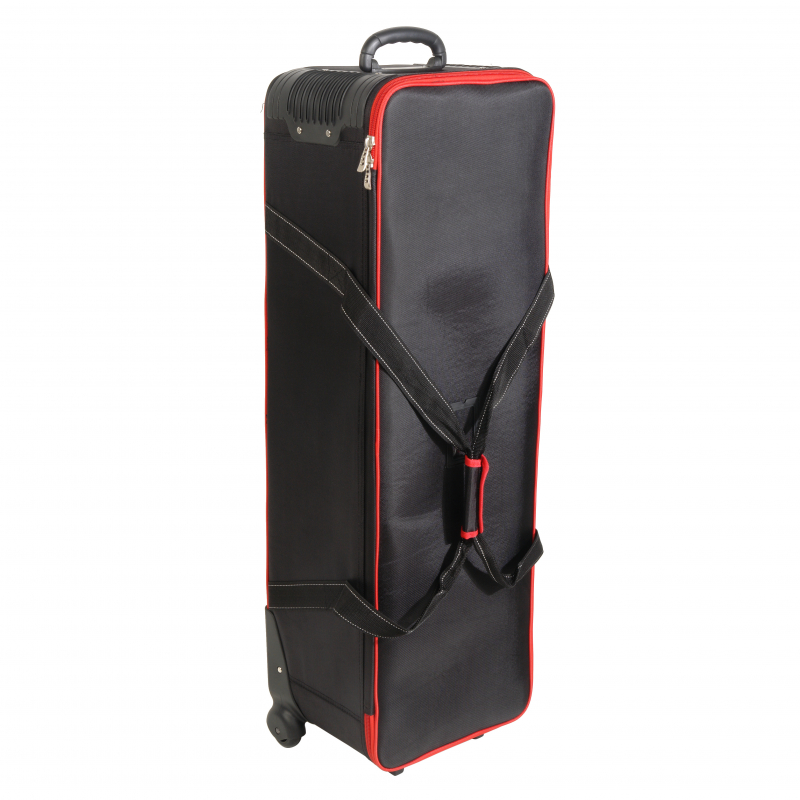 Сумка с колесами на подшипниках для транспортировки и хранения студийного оборудования, переставляемые перегородки, стяжки для фиксации, жесткое основание, амортизирующая внутренняя отделка, внутренние фиксирующие ремни, сетчатые карманы, размеры внутреннего пространства 101х31х26 см.
